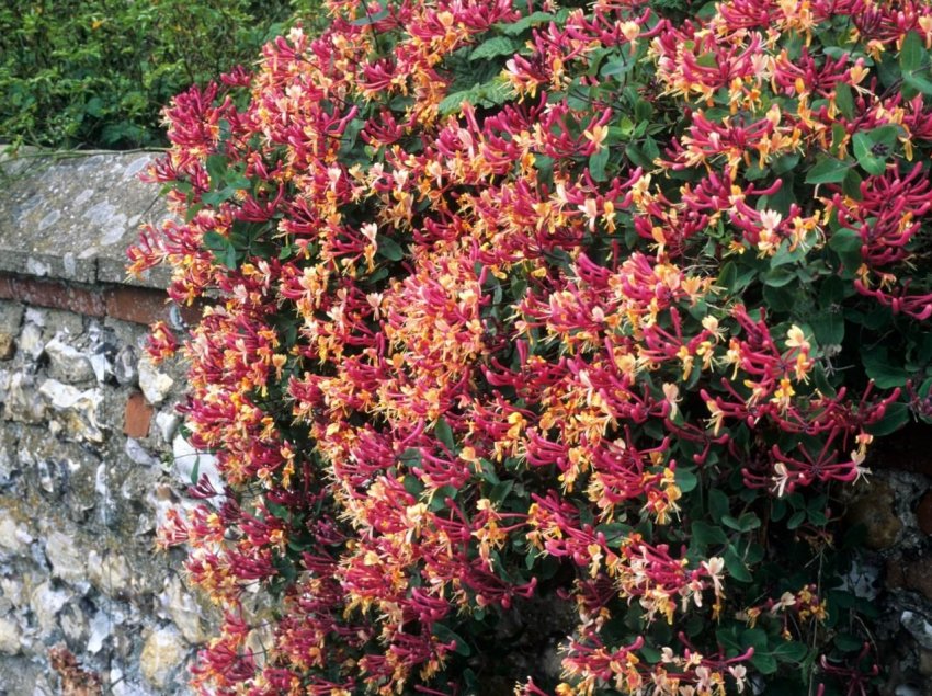 Отмечая специфику посадки жимолости съедобной, не стоит забывать про декоративные сорта. Обычно это вьющиеся лианы, длина которых достигает нескольких метров. Их используют для вертикального озеленение участков, оформления в ландшафтном дизайне.