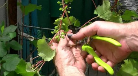 - Объем и количество гроздей на лозах Муромца не соответствуют способности кустов вырастить качественный урожай. Как следствие, ягоды теряют в сладости, мельчают в размере, перегруженные лозы часто ломаются. Второй этап нормировки предполагает удаление лишних гроздей. Если грозди потенциально крупные (600-1000 г в стадии зрелости), стоит оставлять по 1 на лозу, если их итоговый вес едва ли превысит 400-500 г можно оставить по 2 на одном побеге.