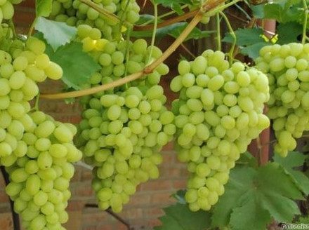 Ягоды светло-салатного цвета, там, где больше всего попадали солнечные лучи, янтарные. Они крупные, имеют овальную, вытянутую форму. Вес одной виноградинки колеблется от 7 до 10 граммов, а длина от 3 до 4 см. При наличии высокорослого подвоя, они могут вырастать еще крупнее. Но в этом случае срок созревания несколько увеличивается, а вкус становится менее выраженным. При созревании, ягоды длительное время не опадают, так как крепко держатся на плодоножке. Кожа винограда плотная, хрустит, слегка покрыта восковым налетом. Ягодки имеют отменный сладковато-кислый вкус. Содержания сахара в плодах до 20%, кислоты 6-8 грамм/литр. Косточки, которые находятся внутри сочной мякоти крупные, жесткие.