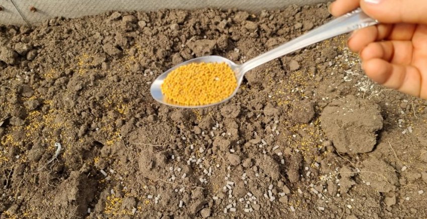 - Вначале рассыпаю по поверхности грядки удобрение по инструкции, затем рассыпаю семена горчицы. Перед выращиванием томатов хорошо сеять сидераты крестоцветных культур, это может быть горчица или масляничная редька.