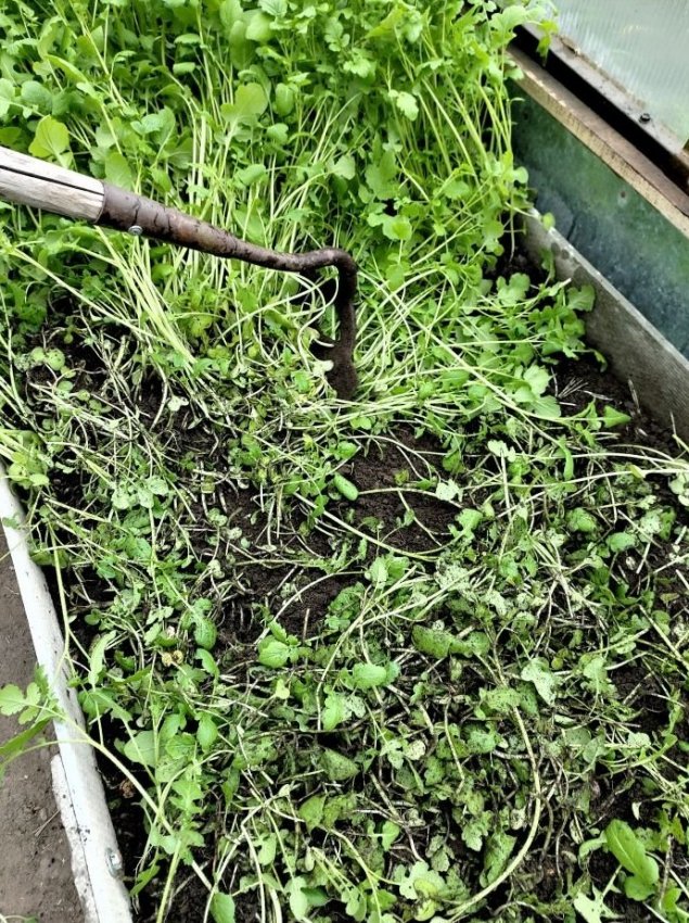Примерно через месяц, когда сидераты вырастут на высоту 15-20 см, заделываю их в почву с помощью тяпки, эта органика перегнивая в почве обогатит её азотом и другими элементами питания.