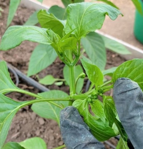 - Далее переходим выше к разветвлению кроны перца. На первой развилке обычно образуется один или несколько крупных бутонов.