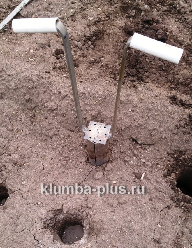 - Вытяните сажалку из земли, образуется ровная, круглая лунка, а ком земли остаётся в трубе. Когда почва немного влажная, стенки лунок держатся хорошо, не осыпаются.