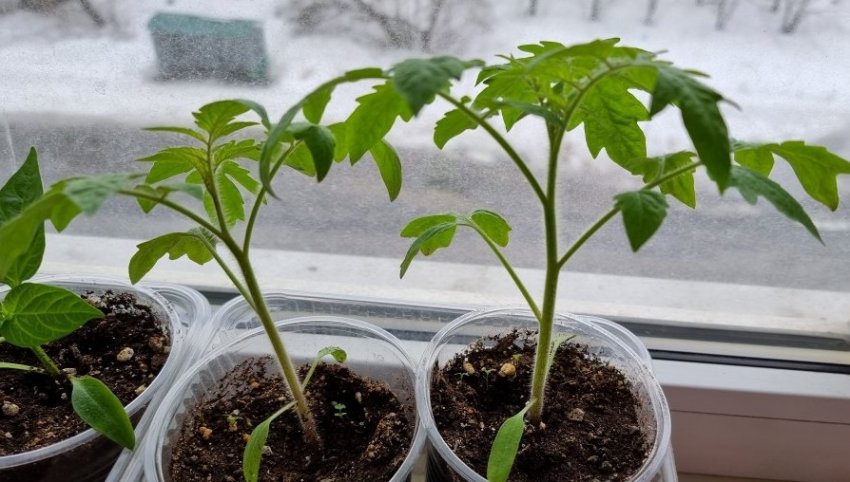 Я поставила растения на лоджии близко к стеклу, где в ясные дни томаты купались в ярких лучах света, земля в рассадных стаканах хорошо прогревалась, из-за чего быстро просыхала. Ночью температура падала до +16…+18. Постоянно были приоткрыты окна, гулял сквозняк, при этом томаты росли в хорошем темпе, не заметила ни одного солнечного ожога на листьях.