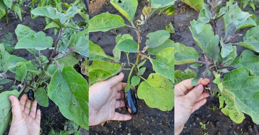 Другой пример: баклажаны в открытый грунт высаживала гораздо позже, рассада уже переросла и начала желтеть. Растения вначале стрессовали в холодные ночи, затем поджаривались под палящим солнцем, подкормку проводила по остаточному принципу, если что останется. Ещё листья баклажанов в открытом грунте на днях побил гряд. В итоге на грядке компактные поджарые кустики, у всех есть завязавшийся плодик, много бутонов.
