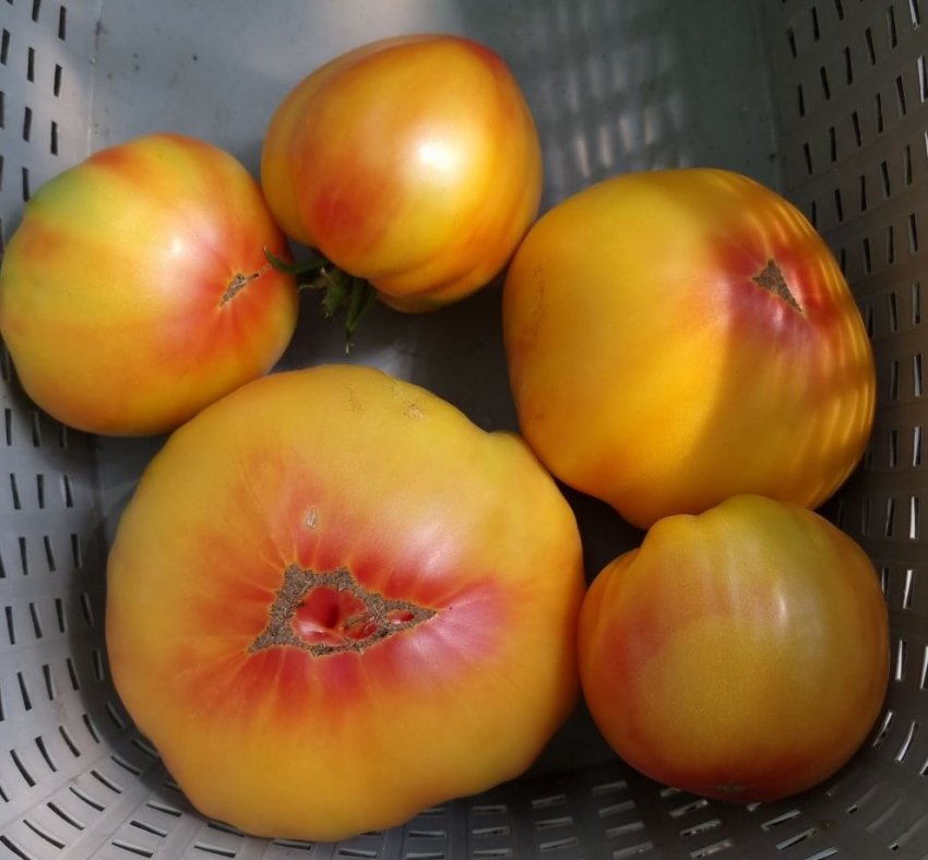 5. Томат Буракерские любимцы самый вкусный и красивый, подробно показывала и рассказывала о нём тут. Этот томат двуцветный жёлто-красный, сочный, мясистый. На первых кистях вырастают довольно крупные плоды, но выше томаты в среднем 300 гр. Это самый сладкий, красивый и крупноплодный сорт в моей коллекции.