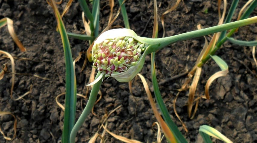 — Воздушная луковица на оставленных 2-3 контрольных стрелах чеснока лопается, обнажая семена.