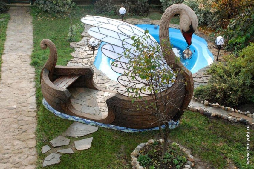 - В последнее время модной тенденцией стало размещение на дачных или садовых участках скульптур. Эти элементы декора могут быть в форме совершенно различных фигур: русалок, сказочных персонажей, лесных нимф, гномов и так далее. Могут быть незамысловатых форм и размеров. Главное правило, которого всегда следует придерживаться в случае размещения на участке скульптур — они не должны нарушать общую стилистику сада. Ведь далеко не каждая скульптура может гармонично вписаться в интерьер приусадебного участка. Материал изготовления этих архитектурных форм может быть различным начиная от гипса или глины, и заканчивая обычным пластиком. Некоторые умельцы мастерят скульптуры из совершенно нестандартных материалов: старые покрышки, бутылки, коряги и так далее.